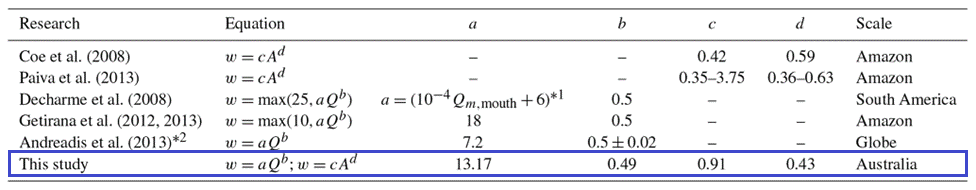 In cases where flow data is unavailable from the GeoFabric Surface Network, estimations have been based on stream flow data within JB Pacific’s nodal point layer. This involves utilising the scaled equation shown above from Hou et al. (2019) to derive channel width.