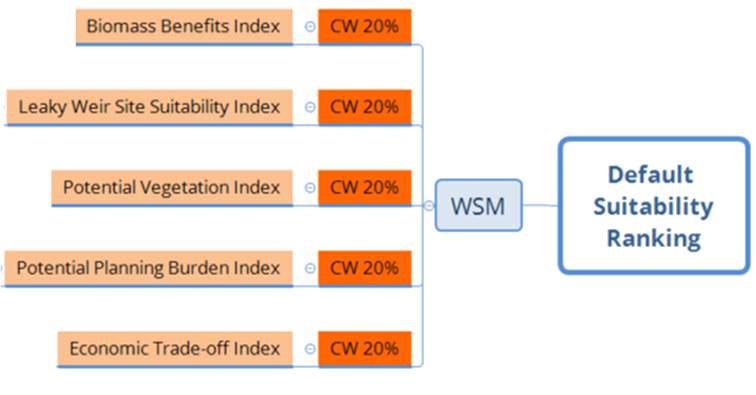 Figure 4: Illustration of input layers and weightings used to derive the Leaky Weir Site Suitability Index